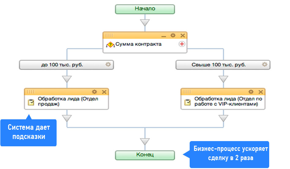 Обработку Лидов и Сделок вы можете автоматизировать с помощью бизнес-процессов. Включите в бизнес-процесс все возможные действия над элементом CRM: разослать письма, назначить ответственных, поставить задачу сотруднику и т.д. Бизнес-процесс может автоматически изменять статусы элементов CRM, заполнять поля, создавать новые элементы, например, сделки.