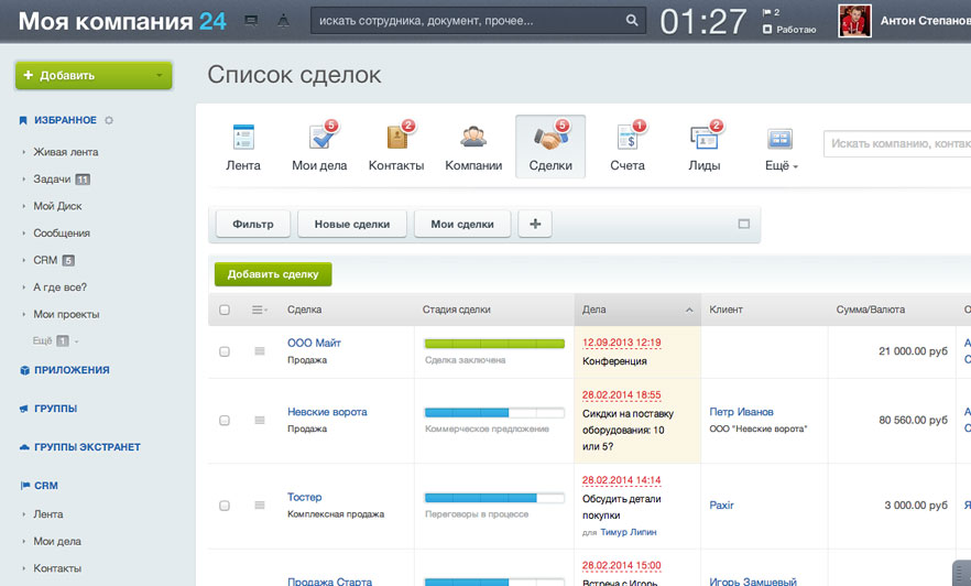 Сделка - конечная цель и желаемый результат работы. Отмечайте в CRM, на каком этапе сейчас сделка: в обработке, в ожидании дополнительной информации, на стадии переговоров, коммерческого предложения или уже заключена. . .
